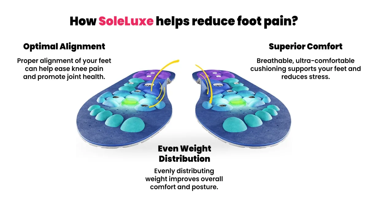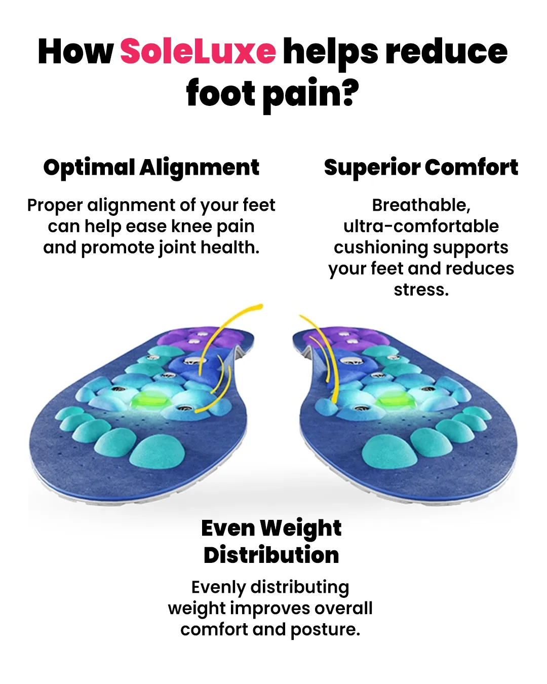 Yes, SoleLuxe insoles are designed to provide support and relief from foot conditions like plantar fasciitis and general foot pain. Their cushioned areas and targeted pain relief features help alleviate discomfort, promoting overall foot health.